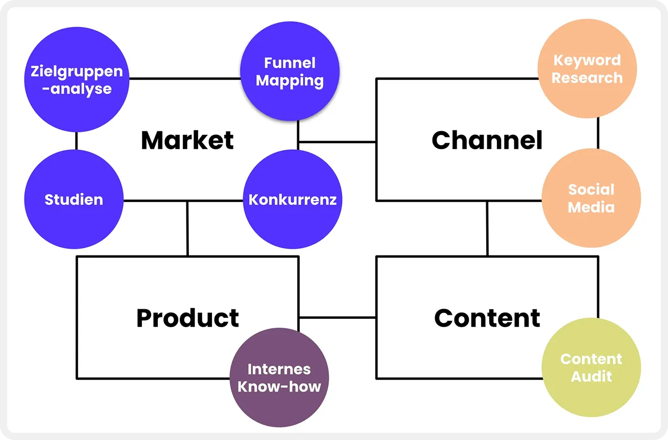 Einen Überblick, woher du überall Ideen generieren kannst, gibt dir diese Darstellung unseres Frameworks für Content-Market Fit: