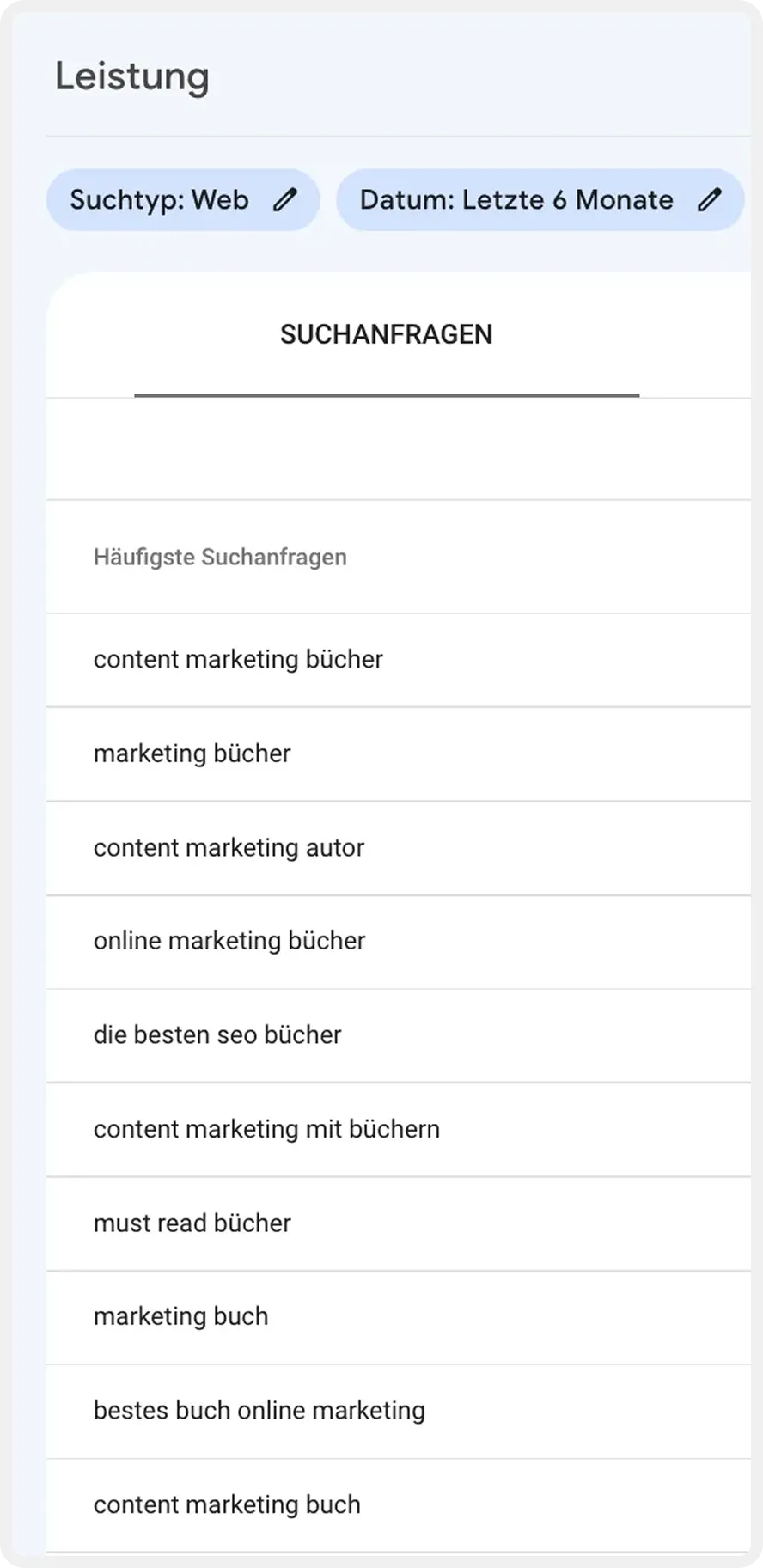 Über die Ergebnisse einer Analyse in der Google Search Console finden wir zudem heraus, welche verwandten Themen sonst noch relevant sind oder auf unserer Website gesucht werden. Zum Beispiel sehen wir beim Thema "Content-Marketing-Bücher", dass auch nach SEO-Büchern gesucht wird.