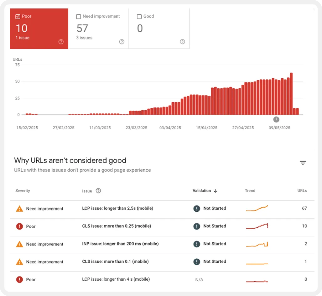 Der "Core Web Vitals"-Bericht aus der Google Search Console ist ein guter erster Indikator, um einen Überblick über die Pagespeed Performance deiner Website zu erhalten. Hier siehst du auf einen Blick, welche URLs bereits gut abschneiden und bei welchen du Optimierungsmassnahmen ergreifen solltest.