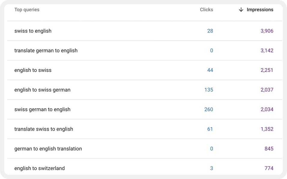 Beim Clustern von Hunderten Long-tail Keywords zeigte sich uns ein klares Muster: Sprachkombinationen wie „deutsch zu englisch“ oder „english to german“ hatten zwar viele Impressionen, aber auch sehr tiefe Rankings und dadurch geringe Klickzahlen.