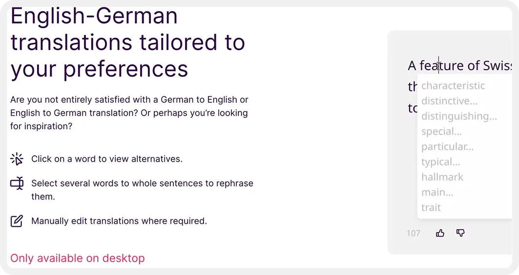 Infolge erstellten wir mit einem einheitlichen Template programmatische Landing Pages. Die Seiten glichen dem Aufbau der Homepage, waren aber auf eine bestimmte Sprachkombination zugeschnitten. Sie enthielten das Übersetzungstool, bereits vorkonfiguriert für das jeweilige Sprachpaar, und ergänzende Content-Blöcke mit passenden Begriffen und Kontexten.