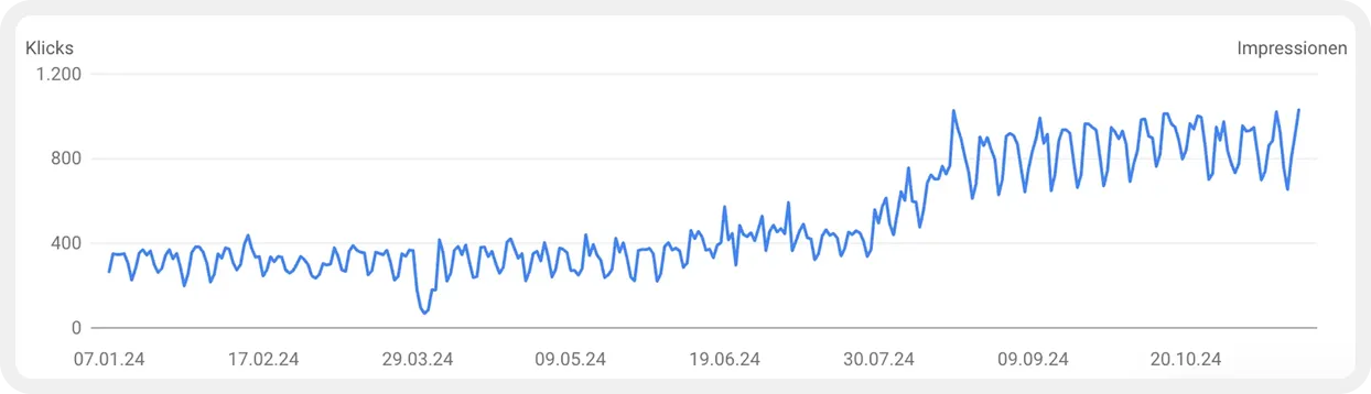 Die Kombination aus spezifischen Landing Pages, technischen Optimierungen und gezieltem Linkbuilding zeigte schnell Wirkung: Die Sichtbarkeit hat sich seit Start der Zusammenarbeit gut verzehnfacht.